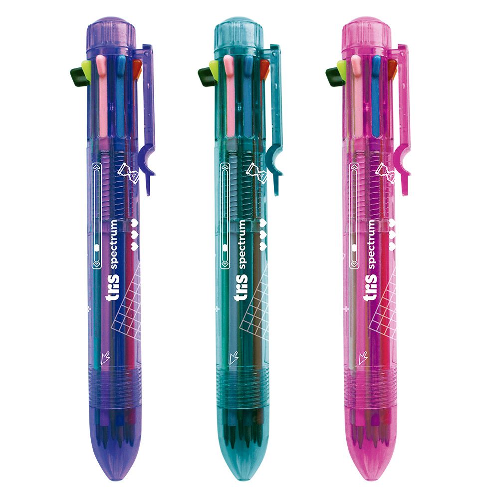 A caneta esferográfica Spectrum possui 8 cores, um clássico da época, e que garante mais praticidade no uso.