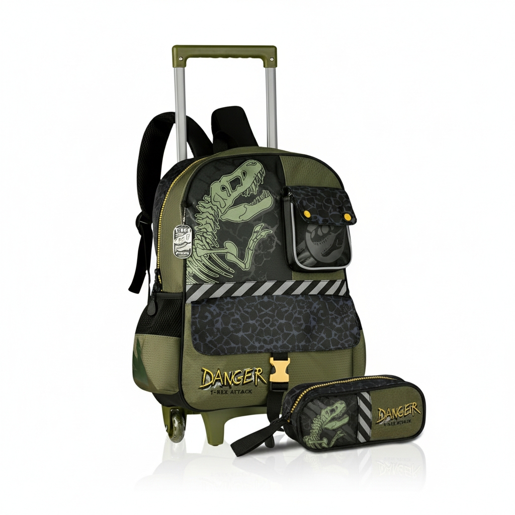 - Mochila Carrinho: Estampa vibrante de T-Rex, compartimento principal espaçoso, dois bolsos frontais e bolsos laterais telados para garrafinha. Puxador Retrátil para usar no chão ou costas