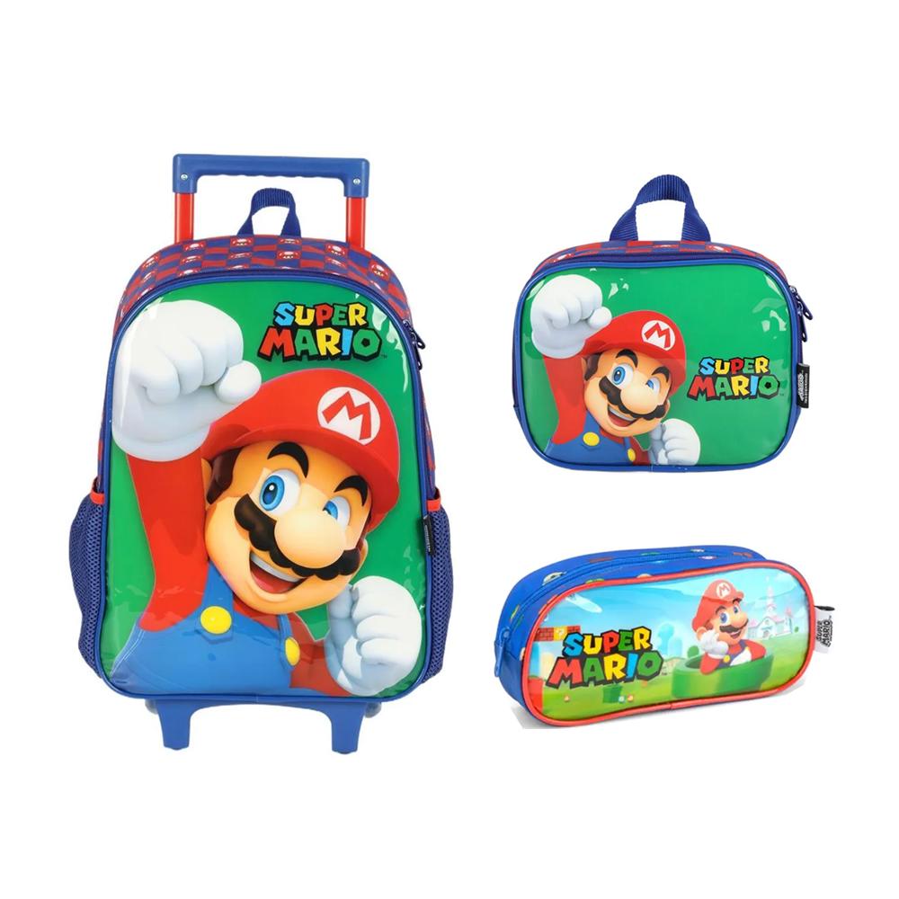 KIT Mochila de Rodinha + Lancheira + Estojo S. Mario Verde