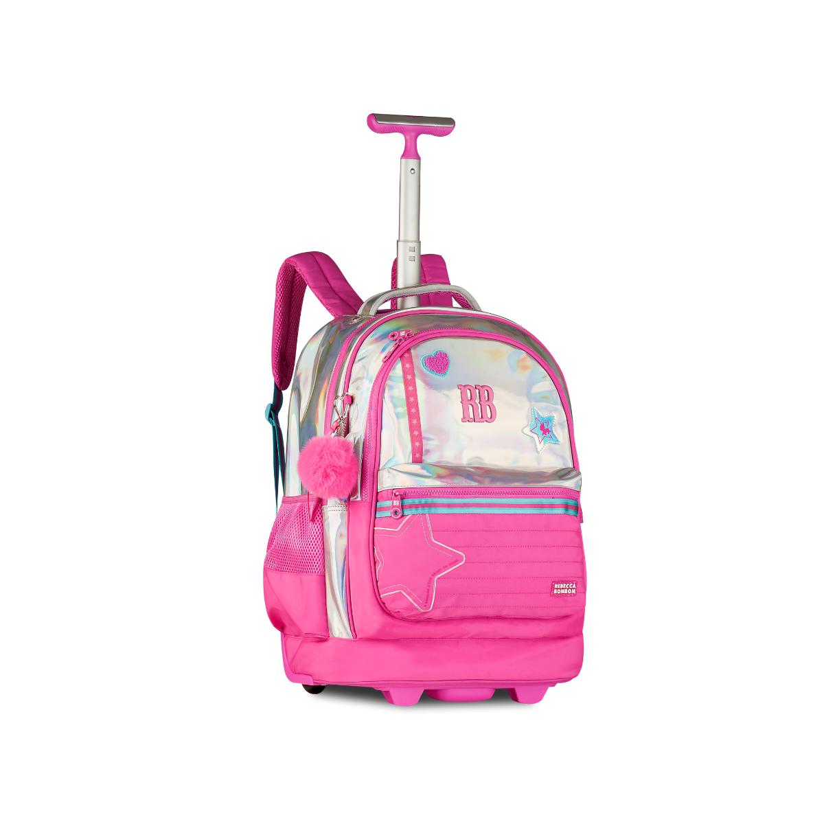 A mochila carrinho da Rebecca Bonbon é o acessório perfeito para quem ama unir praticidade com um visual deslumbrante! Com acabamento holográfico que muda de cor conforme a luz, ela transforma qualquer rotina escolar em um verdadeiro desfile de moda.