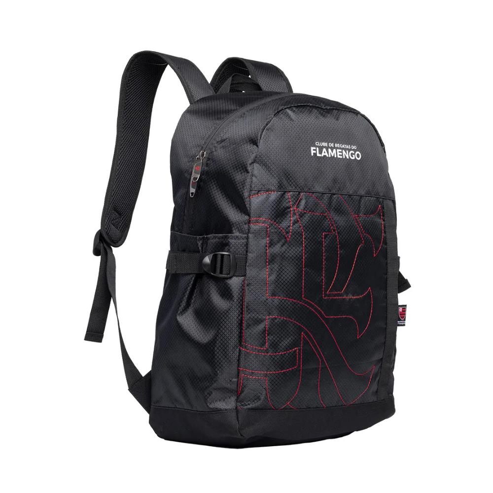 Conforto nas costas e alças: As costas e as alças acolchoadas contam com revestimento em tela com espuma, proporcionando ventilação e conforto mesmo em uso prolongado. O detalhe da costura vermelha reforça o visual flamenguista.
